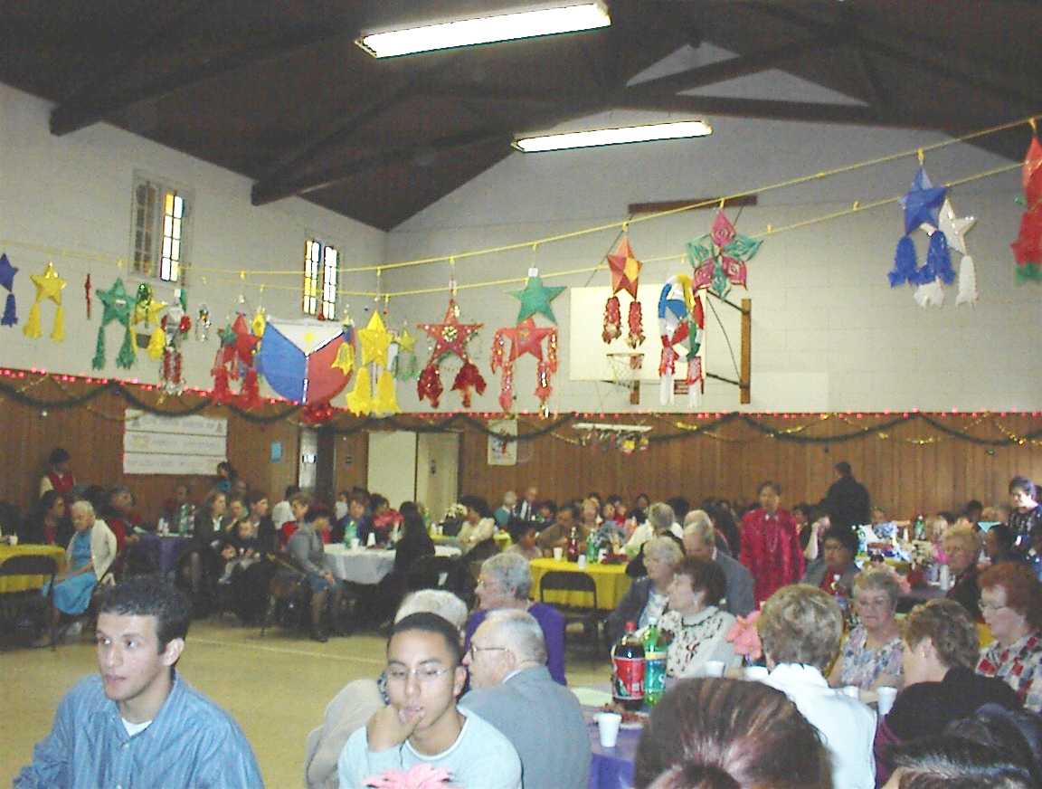 Photo of the Dec. 17 Filipino Fellowship Christmas Program with various colorful parols (bamboo star) hanging above. Also in photo are the members of the Torrance UMC and friends who attended the gathering.